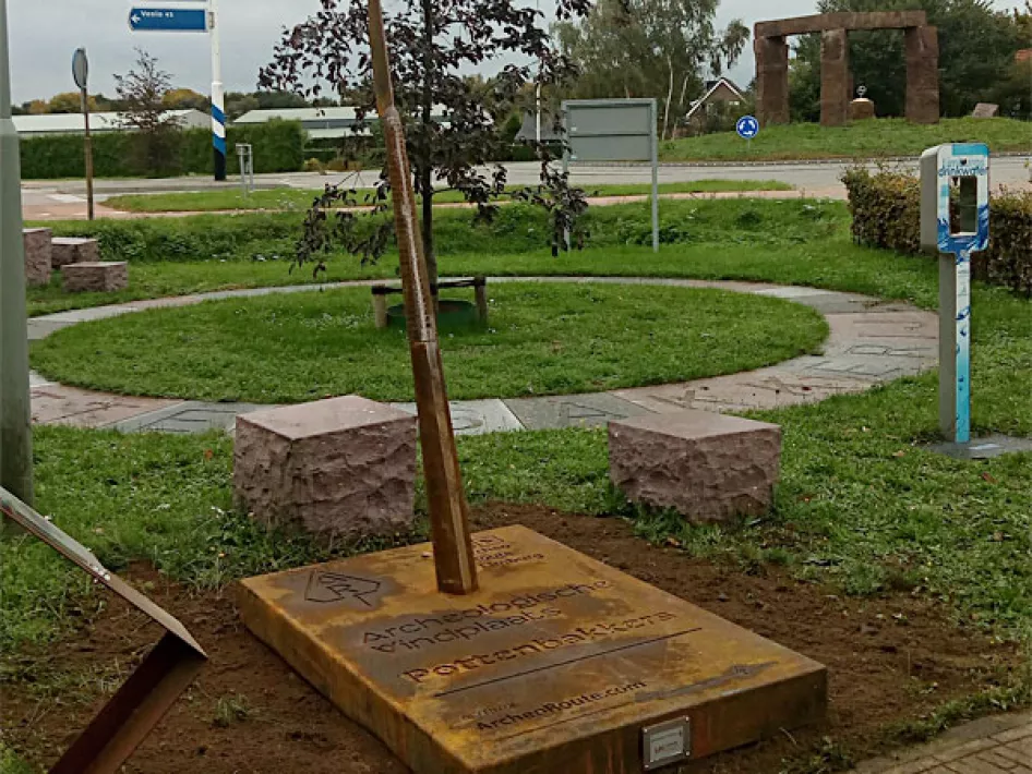 LET OP: Dieser Standort befindet sich in der Nähe des Parkplatzes der alten Töpferei, Rijksweg 22. Gegenüber dem Kreisverkehr an der Ecke Rijksweg/Zwarteweg. Dort finden Sie ein Informationsschild und eine Cortenstahlfliese.